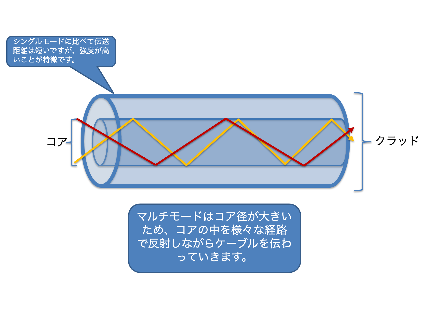 マルチモードはコア径が50μmか62.5μmの光ファイバケーブルです。コア径が大きいため、光はコアの中をさまざまな経路で反射しながら伝わっていきます。マルチモードでは光が複数反射するため、光信号同士が影響を与え合ってしまい、伝送損失が大きくなります。そのため、伝送距離も短く(最大で550m程度)、遠距離通信には向いていません。そのかわり、コア径がシングルモードよりも太いためケーブルの強度が高いのが特徴です。
