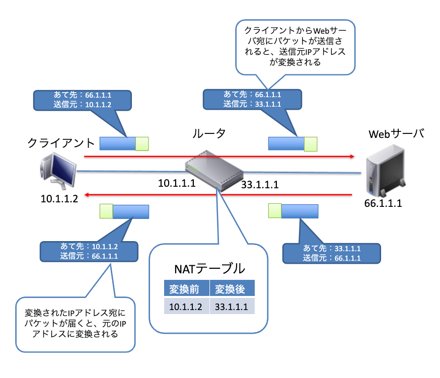 上図の構成を見ると、LAN側のPCのアドレスは10.1.1.2が振られています。もし、このアドレスのままパケットをインターネットへと送信したとしても、すぐに破棄されてしまいます。そこでLANとインターネットの間にあるルータで、送信元IPアドレス(10.1.1.2)を、自身が保持しているグローバルIPアドレス(33.1.1.1)に置き換えてインターネットへパケットを送信します。このときの変換前と変換後のIPアドレスを自身のテーブルに記録しておきます。このテーブルのことをNATテーブル(あるいは変換テーブル)といいます。そのパケットが目的のサーバへと到達すると、そのパケットに対する返信をパケットの送信元IPアドレスである33.1.1.1に返信することになります。ルータへとパケットが到着すると、自身のNATテーブルを確認し、元の送信元IPアドレスである10.1.1.2に置き換えてLAN側へと送信します。この一連の動作によって無事にインターネット上のサーバと通信が可能になります。