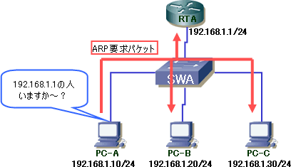 ここでもしRTA(192.168.1.1)のMACアドレスが無かった場合、PC-AはARPの