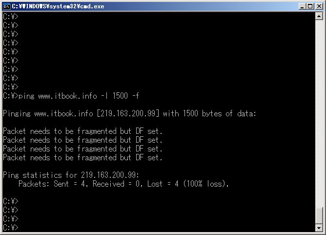 任意のデータサイズでかつ、「-f」オプションでフラグメント禁止でPingを